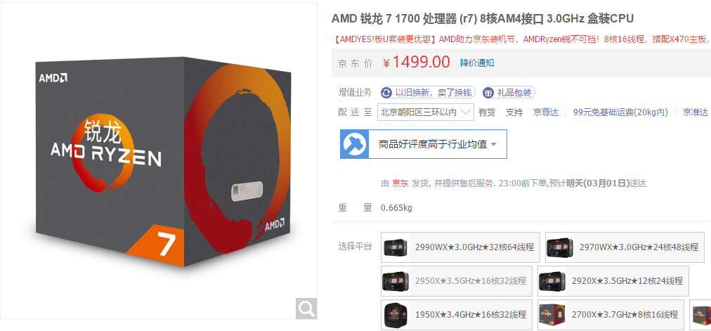 CPU: AMD Ryzen 1700 @3.0GHz内存:金士顿 DDR4 8Gx2 @ 2400