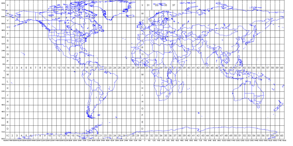 UTM(UNIVERSAL TRANSVERSE MERCARTOR GRID SYSTEM,通用横墨卡托格网系统)坐标是一种平面直角坐标,这种坐标格网系统及其所依据的投影已经广泛用于地形图,作为卫星影像和自然资源数据库的参考格网以及要求精确定位的其他应用。在UTM系统中,北纬84度和南纬80度之间的地球表面积按经度6度划分为南北纵带(投影带)。从180度经线开始向东将这些投影带编号,从1编至60(北京处于第50带)。每个带再划分为纬差8度的四边形。四边形的横行从南纬80度开始。用字母C至X(不含I和O)依次标记(第X行包括北半球从北纬72度至84度全部陆地面积,共12度)每个四边形用数字和字母组合标记。参考格网向右向上读取。