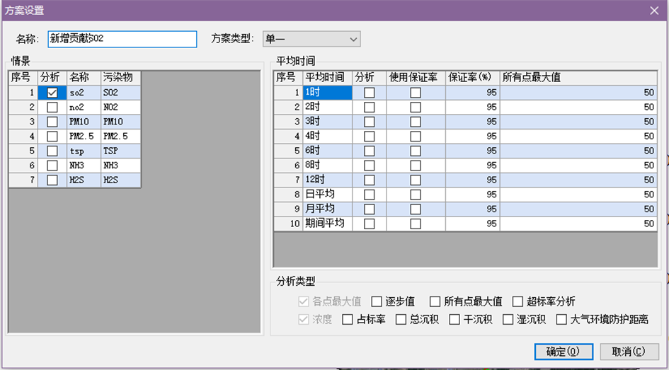 分析类型:方案的浓度的各点最大值是必计算的,方案的所有点高值、逐步值、占标率、超标率分析、沉积和大气环境防护距离是可选计算的。