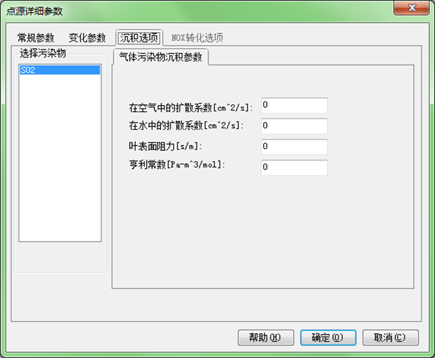 对于某种气态污染物,当在控制选项中考虑了气体污染物沉积作用,应对应的在污染物排放源中输入相应的气体沉积参数。主要有以下参数: