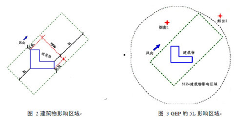 GEP的5L影响区域:每个建筑物在下风向会产生一个尾迹影响区,下风向影响最大距离为距建筑物5L处,迎风向影响最大距离为距建筑物2L处,侧风向影响最大距离为距建筑物0.5L处,即图2虚线范围内为建筑物影响区域。不同风向下的影响区是不同的,所有风向构成的一个完整的影响区域,即图3的虚线范围,称为GEP的5L影响区域,即建筑物下洗的最大影响范围。图3烟囱1在建筑物下 洗影响范围内,而烟囱2则在建筑物下洗影响范围外。