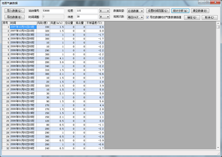 通过双击“项目->AERMET气象预处理->地面气象数据(必选)”打开“地面气象数据”窗口,导入地面气象数据后点击“统计分析”按钮即弹出“地面气象数据统计分析”窗口。