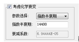 在“控制选项”对话框中选中“考虑化学衰变”复选框,选择“参数选择”的类型(指数半衰期或衰减系数),并设置相应的指数半衰期或衰减系数参数。