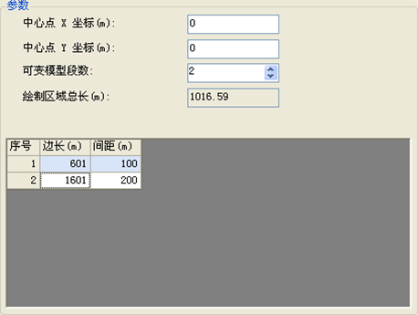第一段:边长601m、间距100m;第二段:边长1601m、间距200m