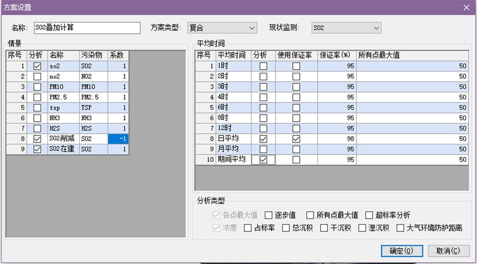 分析类型:方案的浓度的各点最大值是必计算的,方案的所有点高值、逐步值、占标率、超标率分析、沉积和大气环境防护距离是可选计算的。
