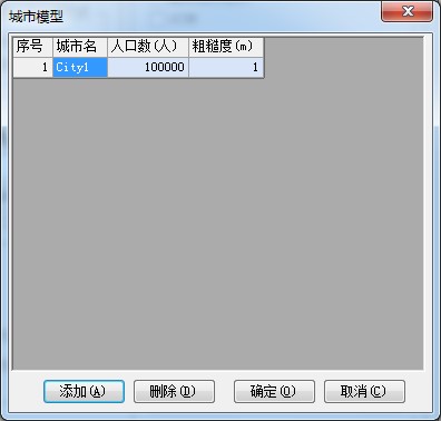 2、在“城市模型”对话框中为项目添加多个城市,输入城市名称、人口数和粗糙度。设置完成后返回项目主界面。