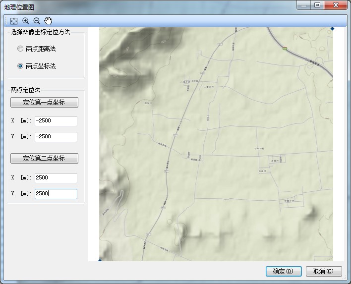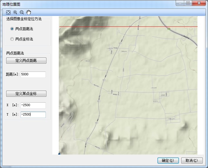 2、打开后进入“地理位置图”对话框,选择“两点距离法”。用鼠标点击“定义两点距离”按钮后在绘图窗口沿位图边绘制一条直线,并在“距离”文本框中输入数值5000。点击“定义某点坐标”按钮后,在图片左下角绘制一个点,并在对应的文本框中输入坐标(-2500,-2500)。见下图: