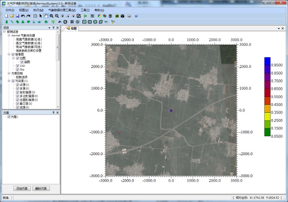 导入背景图可方便的确定污染源、建筑物和关心点位置,用户可以导入多张背景图。比如在导入地理位置图的基础上还可导入厂区平面图,这样可在考虑建筑物下洗时确定烟囱附近建筑物的位置。背景图有位图、AUTO-CAD图和Gis图三种类型。
