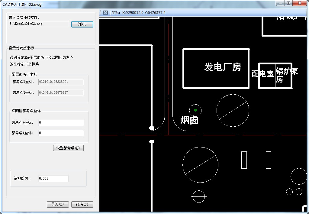 双击“项目->背景图->CAD”节点,打开“CAD文件导入工具”对话框,点击“浏览”按钮后找到“Exaple01”目录下的02.dwg文件,打开后点击“设置参考点”按钮,将平面图上的烟囱设置为原点(0,0),然后将缩放位数改为0.001,点击“导入”按钮即完成CAD图的导入。