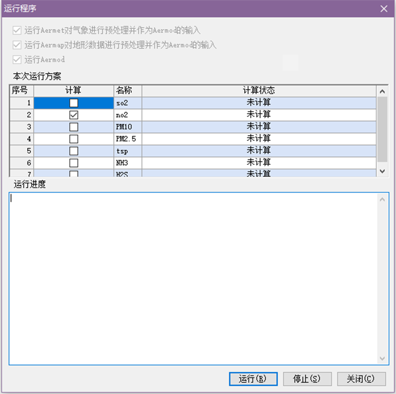 在设置好AERMOD所需的参数,并设置相应的预测方案后,就可以运行软件进计算。软件运行过程分为三个过程:气象预处理、地形预处理、污染物扩散计算。用户可以单独运行其中一个程序,也可以一次运行全部的程序。