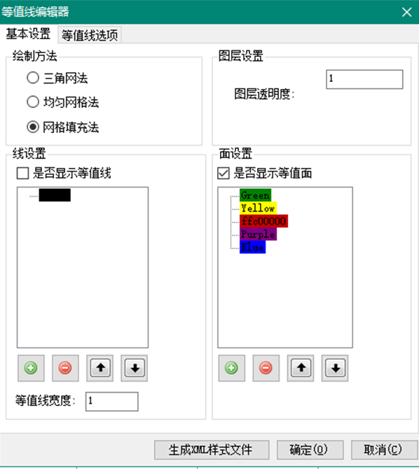 ”,弹出等值线编辑器。在“线面图层设置”选项卡中可以设置线的渐变色、线的宽度、面的渐变色、图层透明度等。