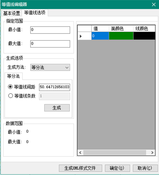在“等值线”选项卡中可以指定需要生成的等值线的范围、生成等值线采用的方法、等值线间距或等值线的条数等,还可以指定等值线的绘制方法(三角网法和均匀网格法),设置完成后点“生成”按钮,确定后退出。