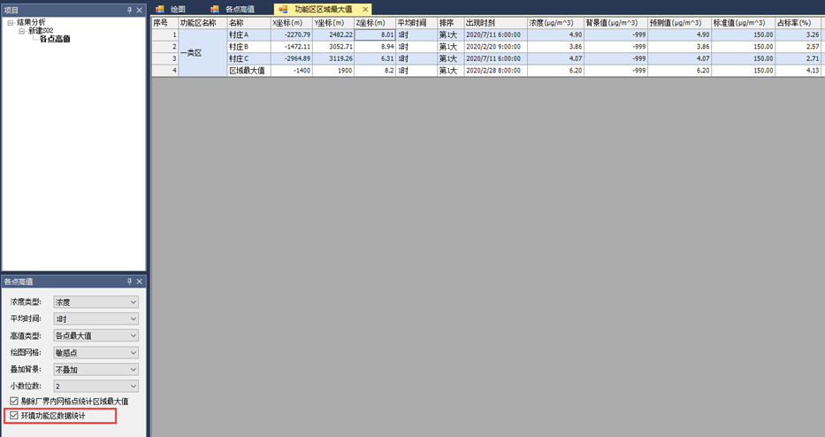 结果统计界面增加了“环境功能区数据统计”,勾选此复选框,结果表格只会展示环境功能区内的敏感点和区域最大值。