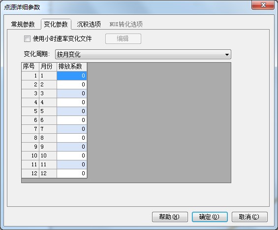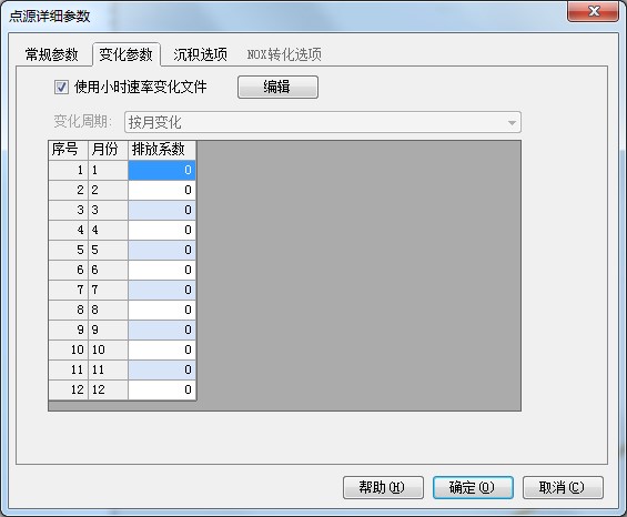 AERMOD考虑了污染物排放速率随时间的周期性变化,有多种变化方案可以选择。在软件的“污染源详细参数”对话框的“变化参数”选项卡中进行设置。分为以下几种情况: