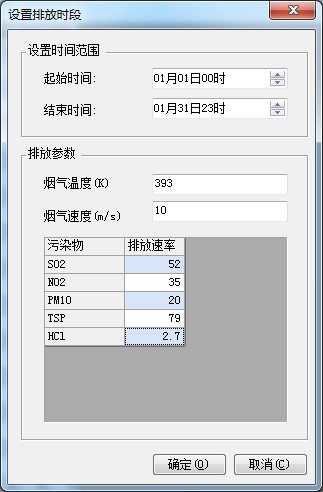 用户可以直接输入污染源在每一个时刻的排放速率,也可以分段输入。如需分段输入,则点击“设置排放时段”,设定“起始时间”和“结束时间”,并输入污染物的排放源强,即可为该污染源设置某一个时段的排放速率。采用这个方法可以为污染源设置多个时段的排放速率。
