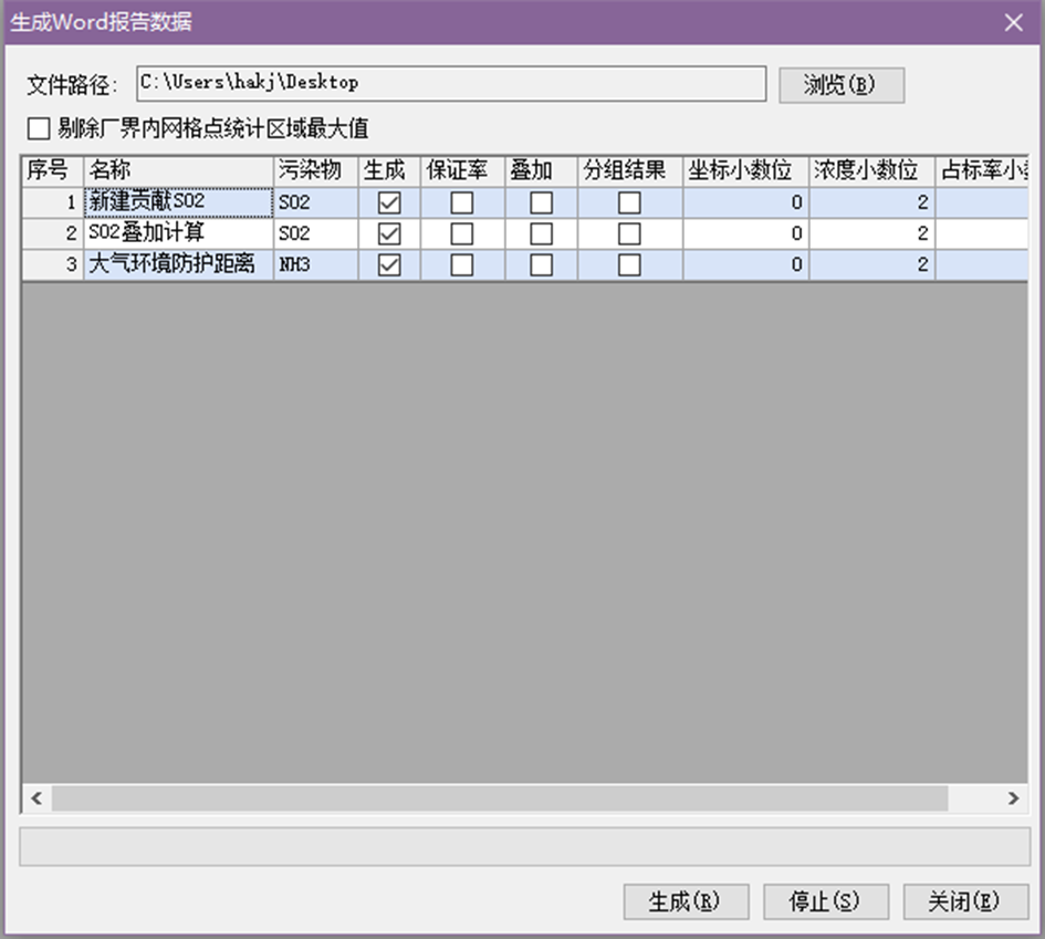 大气AERMODSystem常用操作如何导出word报告数据如何导出word报告数据菜单栏选择工具-生成Word报告数据-设置参数-生成。设置内容包括Word报告存储位置、是否剔除厂界内网格点统计区域最大值、选择需要生成的方案、保值率、叠加背景值、分组结果、设置坐标小数位、浓度小数位、占标率小数位。