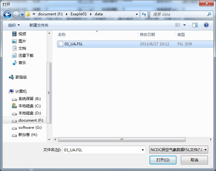 3、从文件类型下拉框中选择“NCDC探空气象数据FSL文件(*.FSL),然后找到“Exaple01\Data”文件夹下的01_UA.FSL文件,点击“打开”按钮导入探空气象数据。