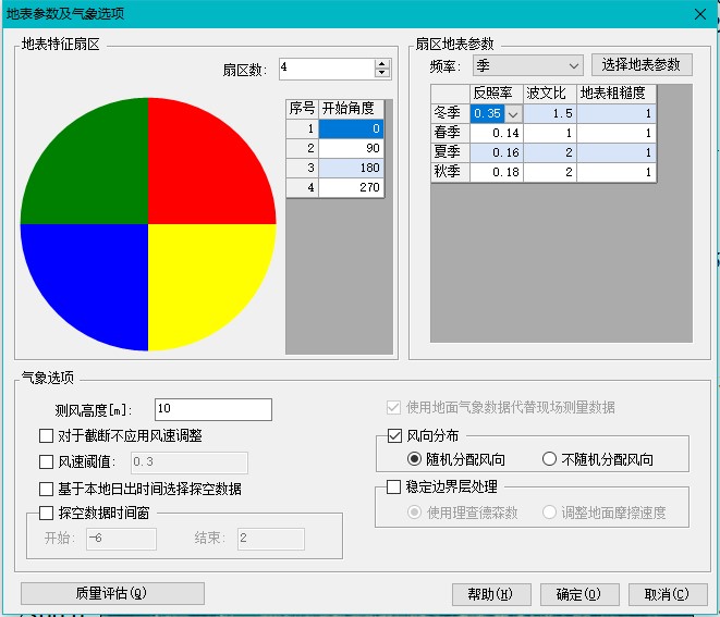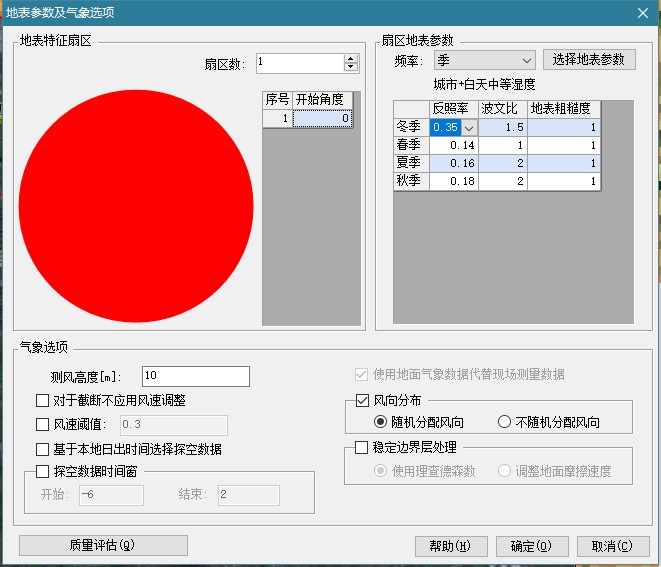 地表参数中的反照率、反照率、地表粗糙度等会影响到混合层高度,用户应根据项目所在区域下垫面特征进行设置。地表参数可按扇区和季节设定。“地表参数及气象选项”对话框左侧设置扇区数,右侧可按年、季、月设定,选择地表参数就可根据地表类型和空气湿度设定左侧选择扇区的地表特征。默认值为“城市”和“白天中等湿度”。