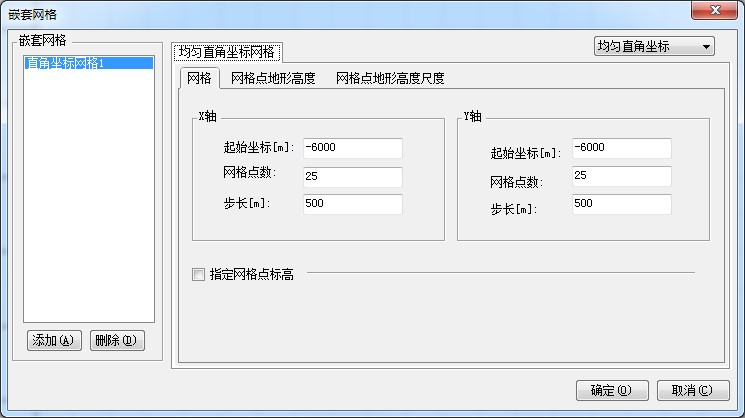 用鼠标双击“项目”窗口中“网格和关心点->直角坐标网格”节点,将弹出“直角坐标网格”对话框。如下图所示: