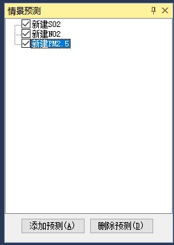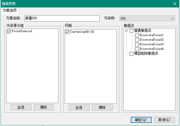 通过前面的设置已经完成了项目的基本设置,需要根据不同的情景组合来设置不同的预测模拟情景。从“方案”窗口中单击“添加”,弹出“情景预测”对话框。用户需要先选定预测的污染物,并添加至少1个污染源,关心点、网格。如下图所示: