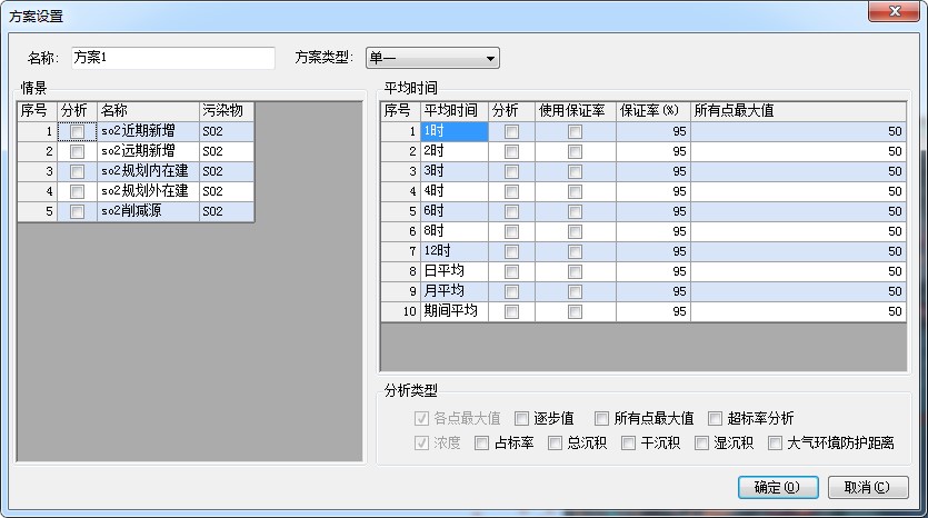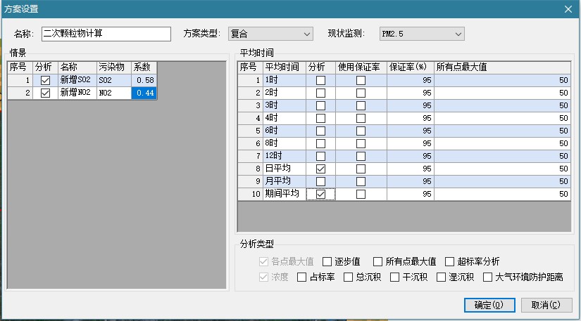 分析类型:方案的浓度的各点最大值、逐步值是必计算的,方案的所有点高值、占标率、超标率分析和沉积是可选计算的。