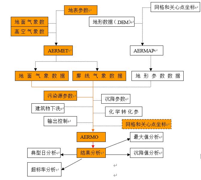 在开始一个项目之前,我们先看看AERMODSYSTEM 4.0核心模块的运行流程。AERMODSYSTEM 4.0集成了EPA的气象预处理模块(AERMET)、地形预处理模块(AERMAP)、建筑物下洗预处理模块(BPIPRIME)和扩散计算模块(AERMOD)四个模块,以下是AERMODSYSTEM 4.0全部模块和主要运行流程,最基本的运行需包括橙色框内的部分。