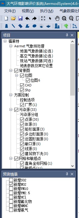 AERMODSYSTEM 4.0的界面较简洁,主要有菜单栏、工具栏、状态栏、项目窗口、方案窗口、绘图窗口、计算结果显示窗口等。