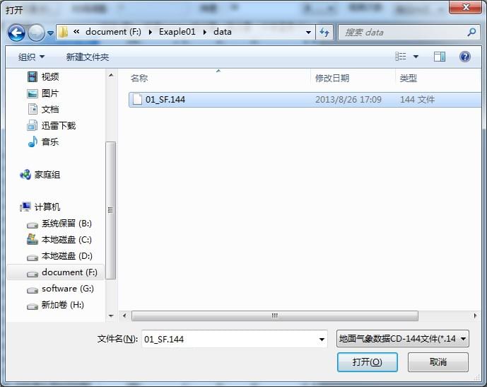3、从文件类型下拉框中选择“NCDC地面气象数据CD-144文件(*.144),然后找到Exaple01\Data”文件夹下的01SU.144文件,点击“打开”按钮将导入地面气象数据。