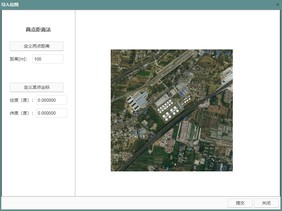 平台支持常见位图(jpg、BMP等格式)的导入,两点距离法通过定义背景图上任意两点的直线距离(实际的距离m)及图上任意点的相对坐标。