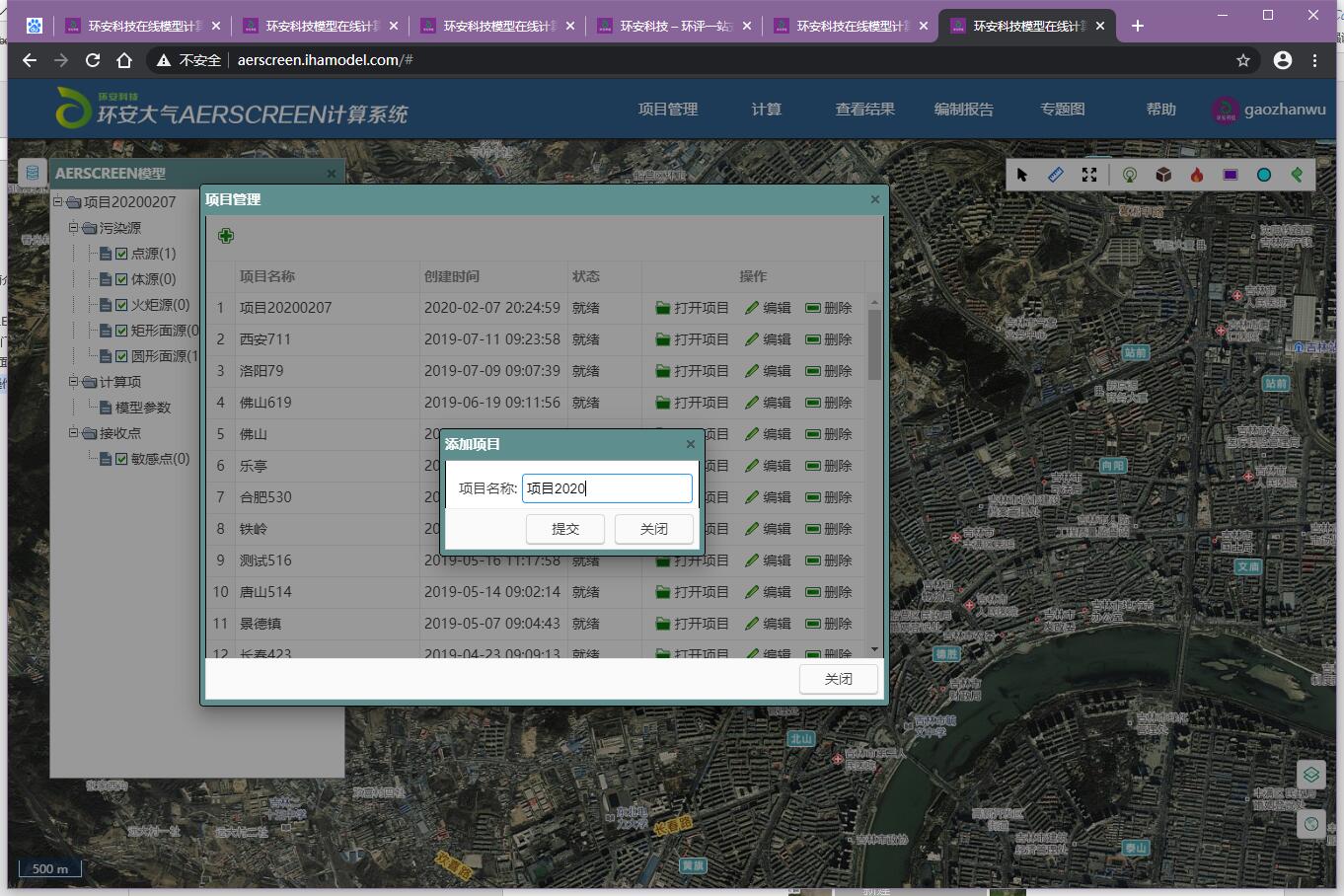 在界面右上位置是模型的菜单栏,包括项目管理、计算、查看、模型、编制报告、专题图、帮助;界面左侧的项目窗口,包括污染源、计算项、接收点;界面的右下角显示界面比例尺;左下角有光标位置的实时经纬度坐标、图层切换选项、图层控制按钮。