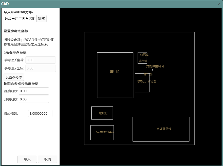 在导入图形后,需设置导入图形与相对坐标系的对应关系,平台通过设定两者参考点之间的坐标关系实现。单击“设置参考点坐标”按钮后,再用鼠标点击背景图域参考点位置,并在背景图参考点坐标区输入XY坐标值,即设定完毕。点击“确定”。等待平台将图形导入到背景图即可。