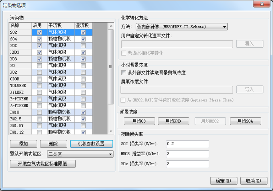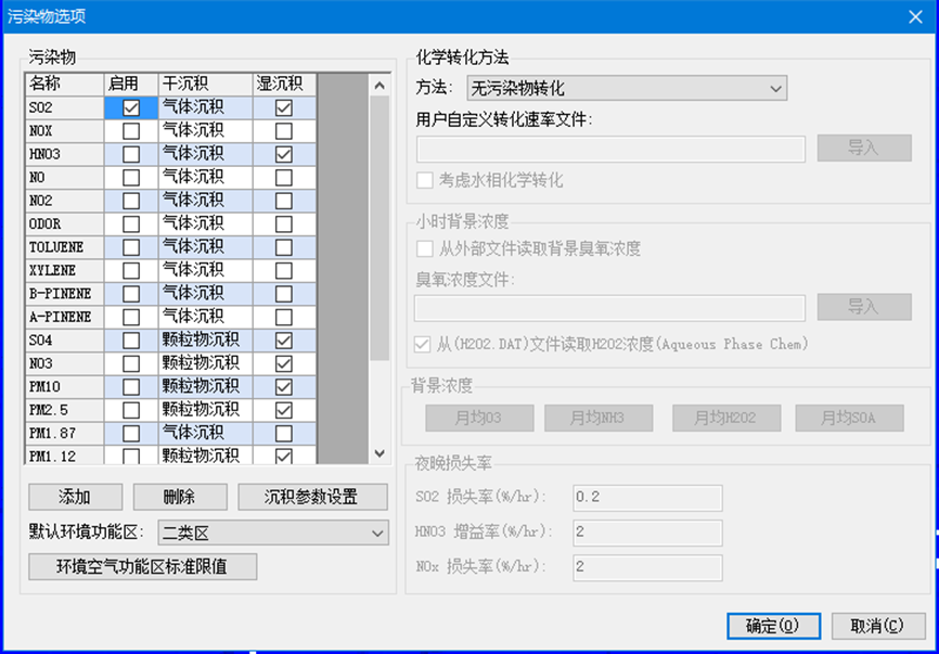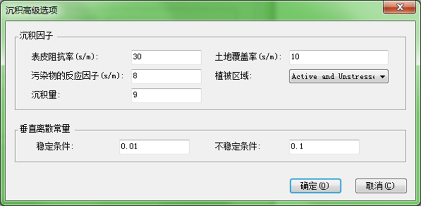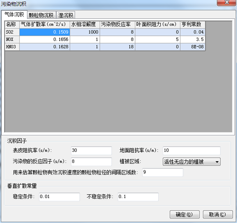 污染物沉积参数中列出了选中污染物的干湿沉积参数,软件中的污染物已经给出了默认的沉积 参数。干沉积中可分为气体沉积和颗粒物沉积。
