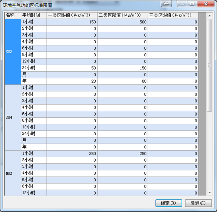 软件为每个污染物设置了一类区、二类区和三类区的标准值,标准采用了《环境空气质量标准》(GB3095-2012)。用户也可以自行修改,并且为新添加的污染物设定标准值。