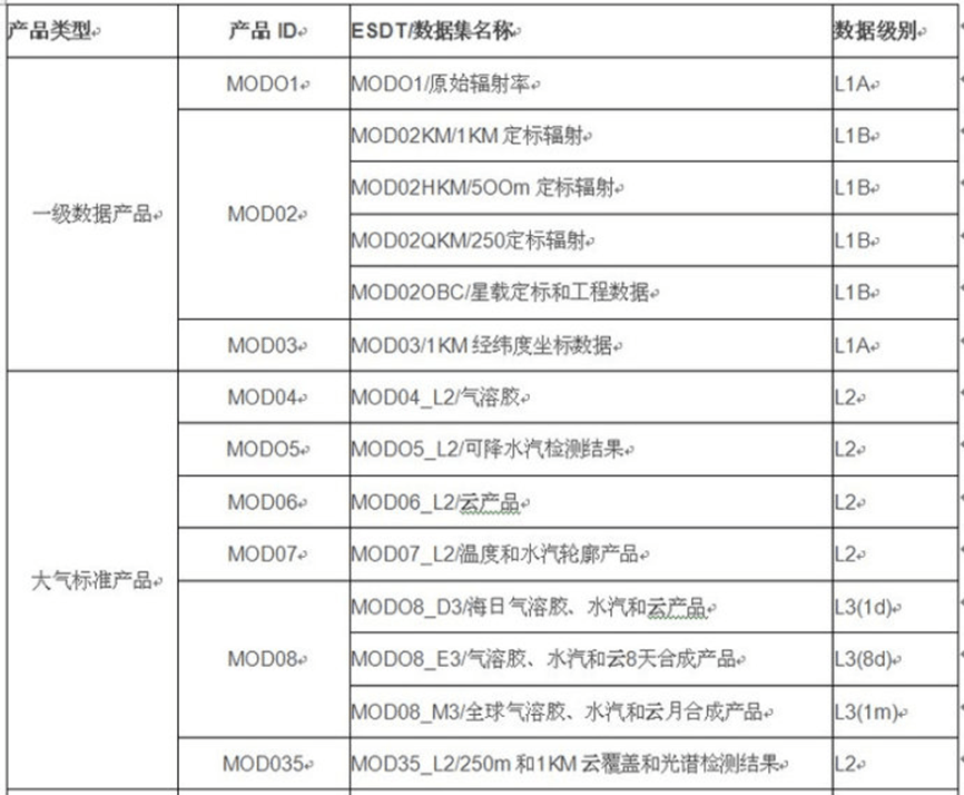 - 2级产品:指L1B级数据,经过定标定位后数据,本系统产品是国际标准的EOS-HDF格式。包含所有波段数据,可能是应用比较广泛的一类数据