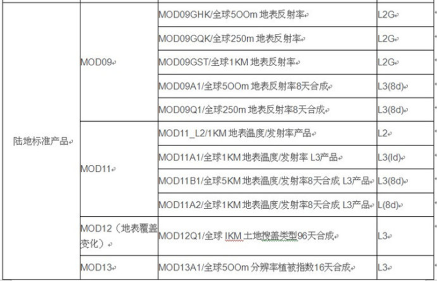 - 4级产品:由参数文件提供的参数,对图像进行几何纠正,辐射校正,使图像的每一点都有精确的地理编码、反射率和辐射率。L4级产品的MODIS图像进行不同时相的匹配时,误差小于1个像元。该级产 品是应用级产品不可缺少的基础