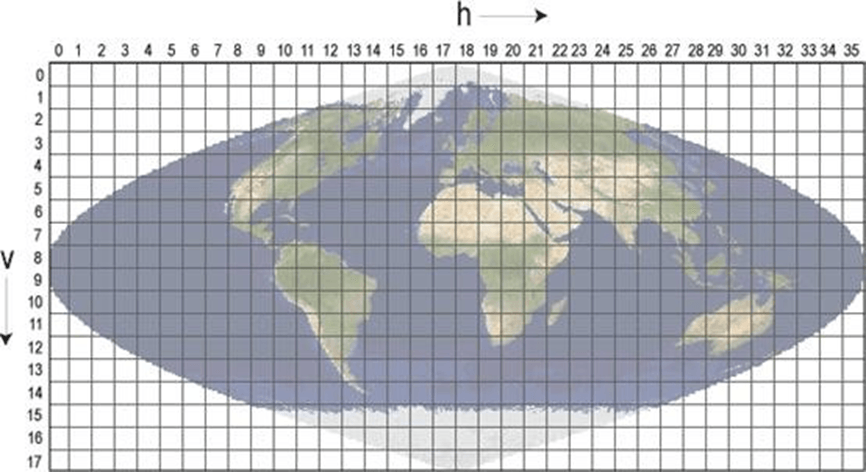 MODIS陆地标准产品数据都采用TILE类型进行组织即以地球为参照系, 采用了SIN(ISIN,正弦曲线投影) 地球投影系统,将全球按照10°经度10°纬度(1200KM1200KM)的方式分片(如下图),全球陆地被分割为600多个Tile,并对每一个Tile赋予了水平编号和垂直编号。左上角的编号为(0,0)右下角的编号为(35,17)。