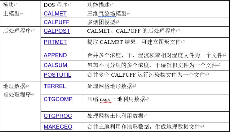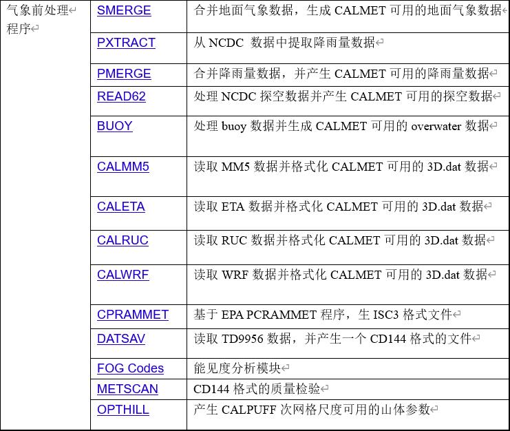 | CALPOST | 后处理程序,处理CALPUFF和CALGRID预测的时间平均浓度和沉降量,可计算能见度 |