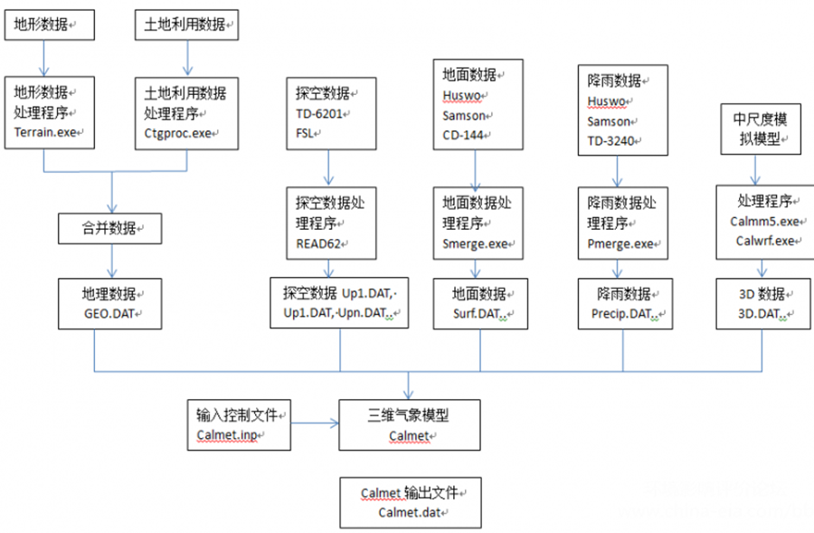 Calpuff模 型系统包含两个个主要组件:Calmet,Calpuff和前后处理程序,前处理程序包括了地面气象数据、探空气象数据、中尺度气象模型模拟数据、地形数据和土地利用数据处理程序,后处理程序包括除了CALMET三维气象模拟结果处理程序PERMET 和CALPUFF浓度预测结果处理程序。