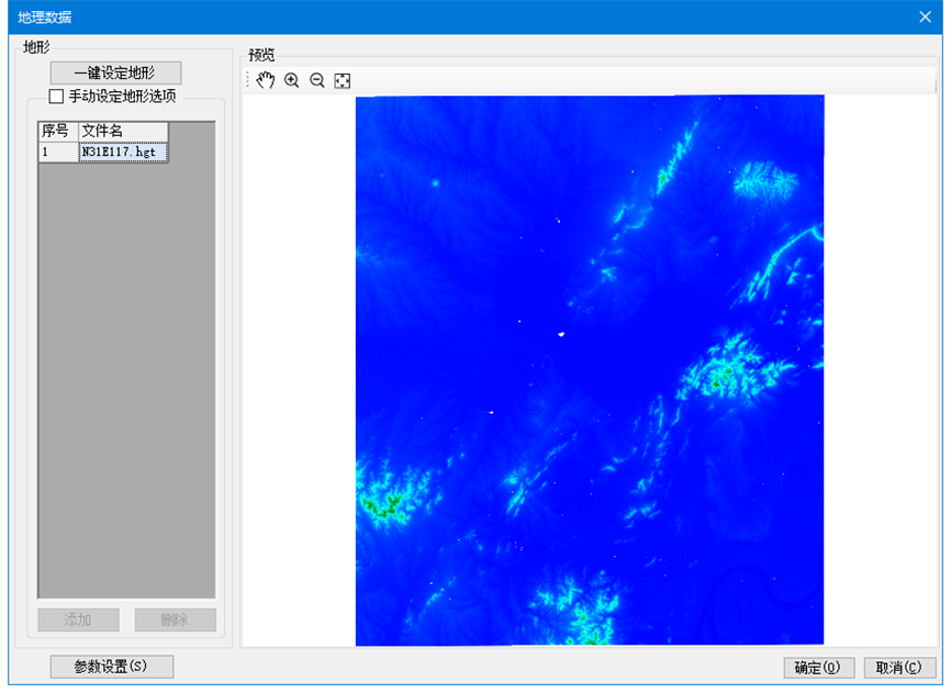 软件自动获取网格范围内的地形数据,并显示到右边的示意图中,用户需首先将地形数据放置到指定目录中,请参考地形数据一节。