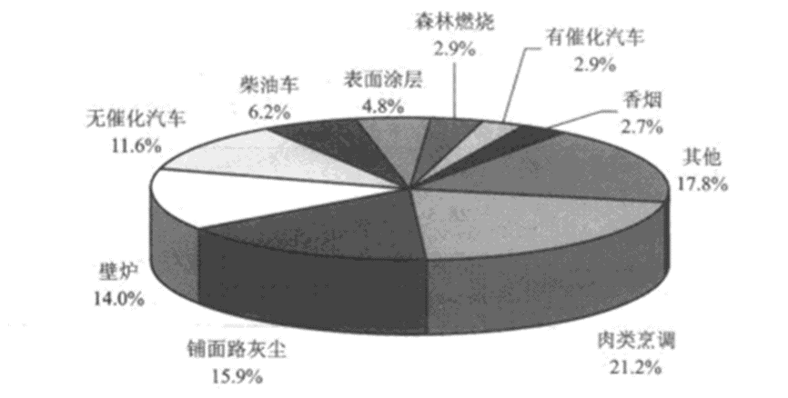 从化学组成上看,有许多对人体有致癌危害的物质,如多环芳烃(polycyclic aromatic hydrocarbons, PAHs)和亚硝胺类化合物,70 ~ 90%在小于等于3.5 μm范围脂肪烃和羟酸  80~90%在小于等于3 μm范围。