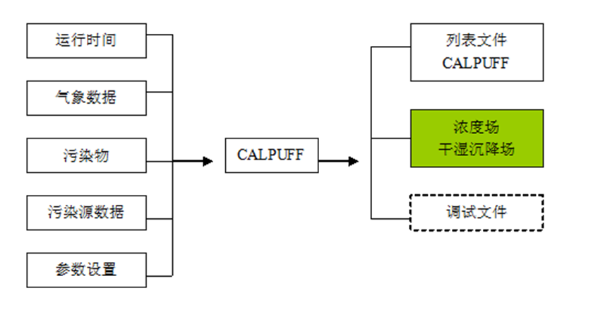 用户在运行CALMET之后,就可以设置运行CALPUFF,一个简单CALPUFF运行,其简要流程下图,其中实线框是我们必须设置的地方,虚线框是可选,绿色框是我们最终得到的文件。