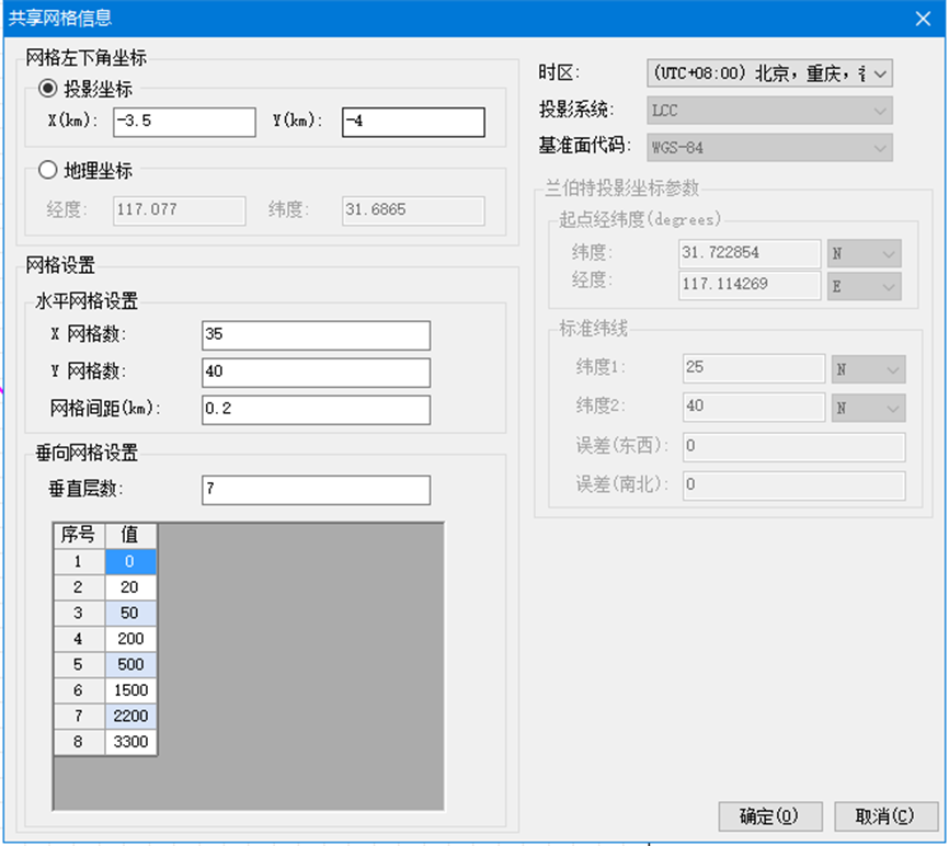 2、网格左下角坐标中选择投影坐标,输入网格左下角的投影坐标,本次模拟区域为南北长8km、东西方向长7km,以污染源坐标为坐标原点,故输入网格左下角坐标为-3.5km和-4km。